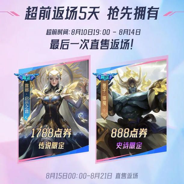 王者荣耀2025KSL主播联赛,带来了两款皮肤的超前返场,一款是露娜的传说皮肤启示之音,一款是墨子的史诗皮肤降魔。感兴趣可以关注一下,超前返场的时间是8月10日至8月14日,为期5天。8月15日开始正式直售返场。墨子这款皮肤的风评不是很好,而且有圣斗士的天蝎座,基本是没什么市场的。