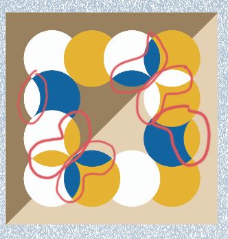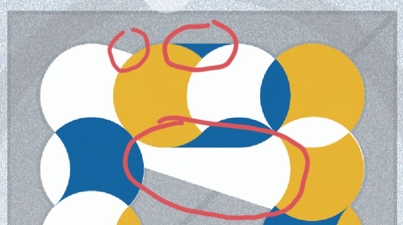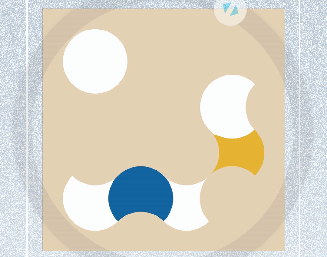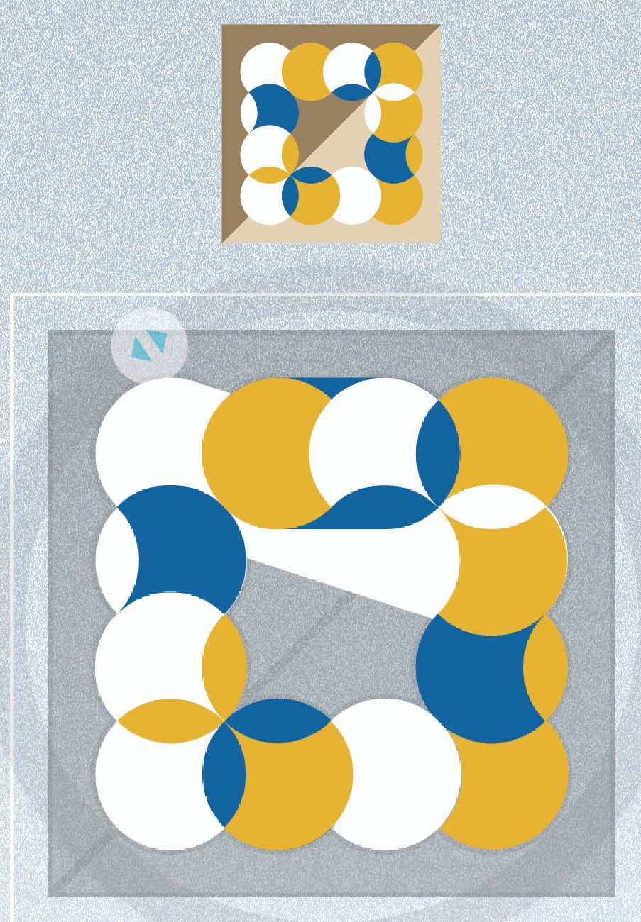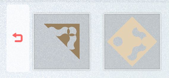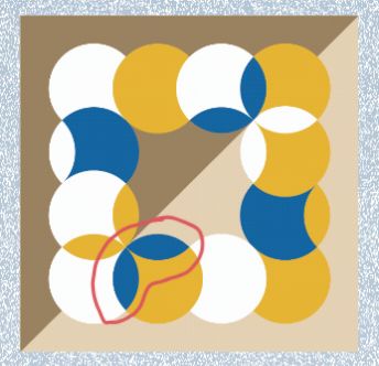 注意到图片中出现很多叶状图形。从给出的零件看,这些地方只能是圆形与伞形的叠加。叶状图形的颜色取决于下方圆形的颜色。
