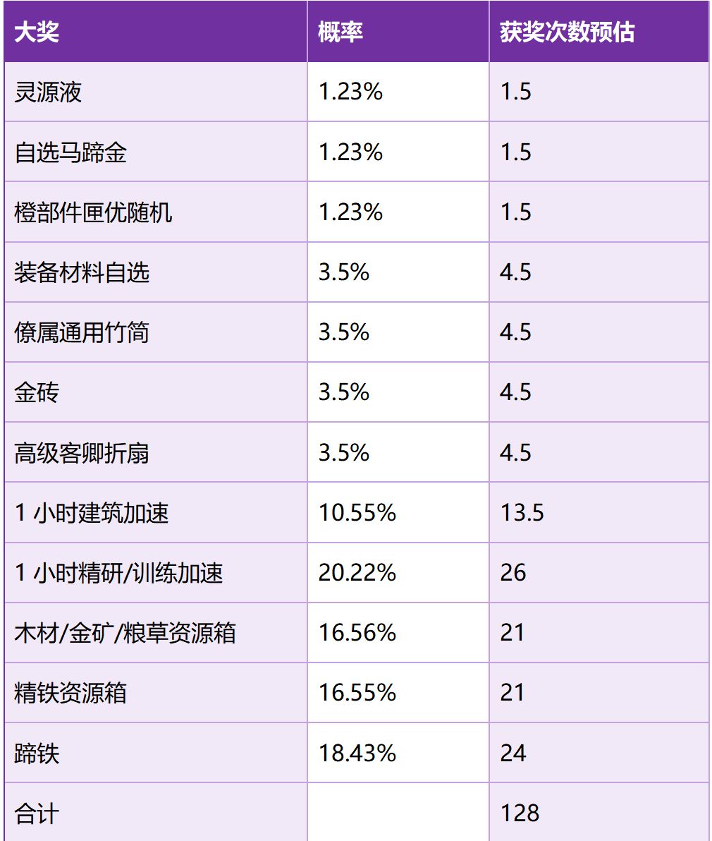 中氪玩家共可获得128个水壶,按奖励概率可得随机奖励如图(见图5)