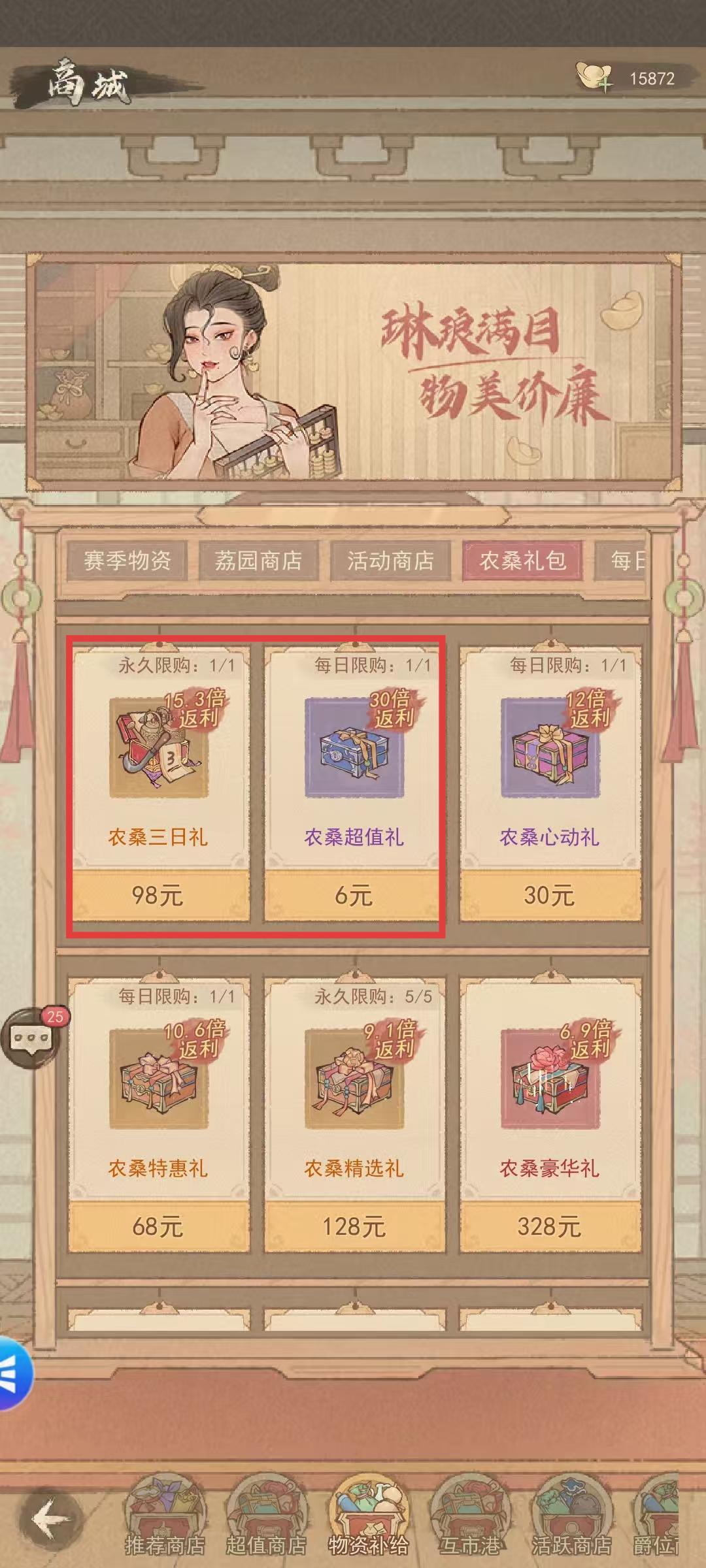 2、中低氪玩家礼包建议:每日6元礼包(6*7)/农桑三日礼(98元)/征荔符蝶手册(30+98元),可获取56个