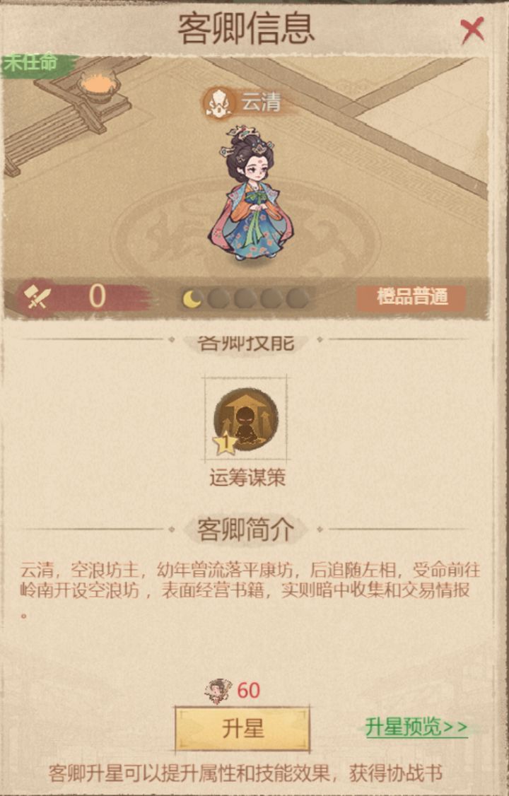 1、橙品客卿—云清。上车后可获得伤害免费2%,征讨能力可提升行军速度、戎车破坏值和府兵生命、攻击,披甲能力可降低受物理伤害、防御、暴击抵抗力。适用于攻城、打仗期间,配备后可全面提升戎车战力。