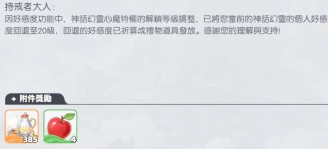 神话幻灵心魔特权的解锁等级由25调整为20(玩家持有的神话幻灵中好感度等级大于20的,将自动降为等级20;20级以上的好感度经验将自动转换成好感度道具通过邮件返还)。