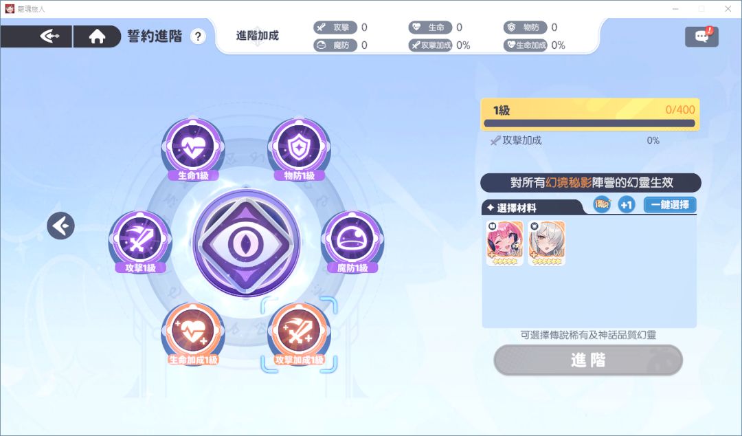 开启条件:拥有10个神格等级满星的幻灵后解锁当持戒者达成誓约进阶功能的解锁条件后,在誓约内各职业、阵营的强化画面处,可消耗对应职业/阵营5星及6星的幻灵提升属性等级,让幻灵的强度更上一层楼!