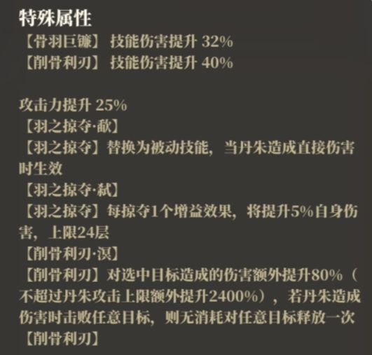 【削骨利刃】对选中目标造成的伤害额外提升80%(不超过丹朱攻击上限额外提升2400%),若丹朱造成伤害时击败任意目标,则无消耗对任意目标释放一次【削骨利刃】