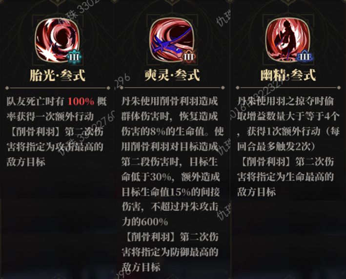 ——三星效果为丹朱偃兵的核心效果:对选定目标造成的伤害额外提升80%(上限为2400%攻击力),配合【削骨利刃】本身的技能效果,最终额外伤害为造成全体伤害的100%(总上限为3200%攻击力),对选定目标造成的间接伤害极大幅度提升,配合击杀目标无消耗释放【削骨利刃】的机制,只要造成一个击杀,就可以直接收割全队