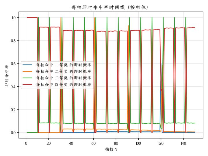 解读:不同阶段对应不同的开放层与保底节奏;四等奖在早期占比极高,而在 60 抽后一等奖出现即时命中率抬升;保底触发点附近,低档即时命中率可能被高档保底顶替而短暂回落。