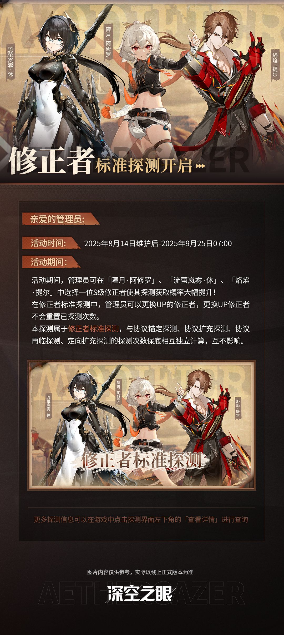 修正者标准探测即将于8月14日维护更新完成后开启,具体探测信息请看下图!