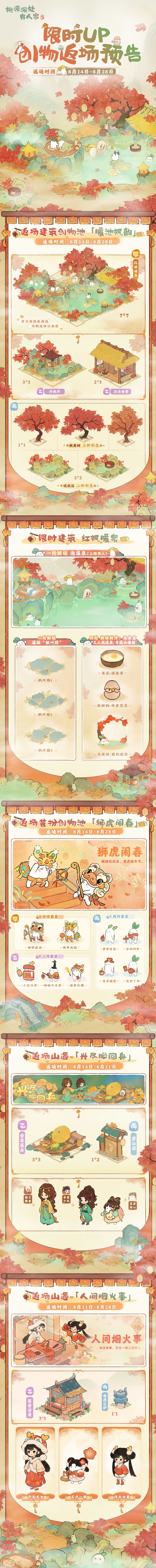 「暖池枫韵」建筑创物池、「狮虎闹春」小萝卜装扮创物池以及「兴尽晚回舟」山遇,即将于8月14日上午10点返场,「人间烟火事」山遇将会于8月21日上午10点开启返场,感兴趣的山民千万不要错过萝!