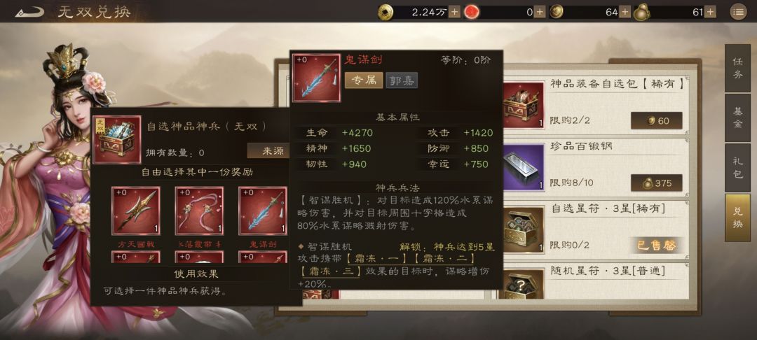 神兵技能:普攻变为aoe伤害,可对十字范围敌军造成伤害,且与携带霜冻的目标作战时提升20%谋略增伤与减伤