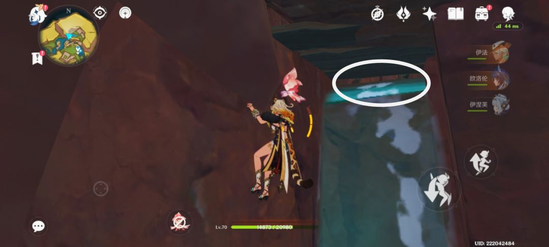 2. 图四所示,开始爬之前换小个角色(如早柚……)爬到顶后在圈起的缝隙中卡进去,