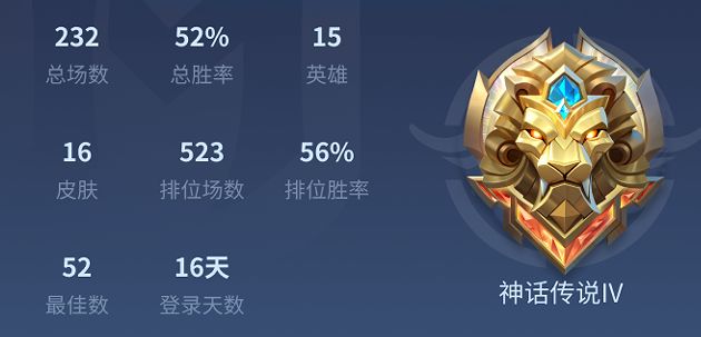 展示您的英雄皮肤拥有数量、总场数、总胜率、排位场数、排位胜率、最佳天数、登录天数具体的数据信息