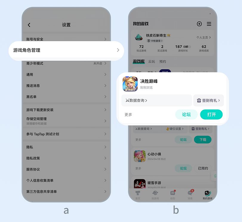 1、安卓端:在TAPTAP我的主页—设置—游戏角色管理,可找到《决胜巅峰》绑定入口