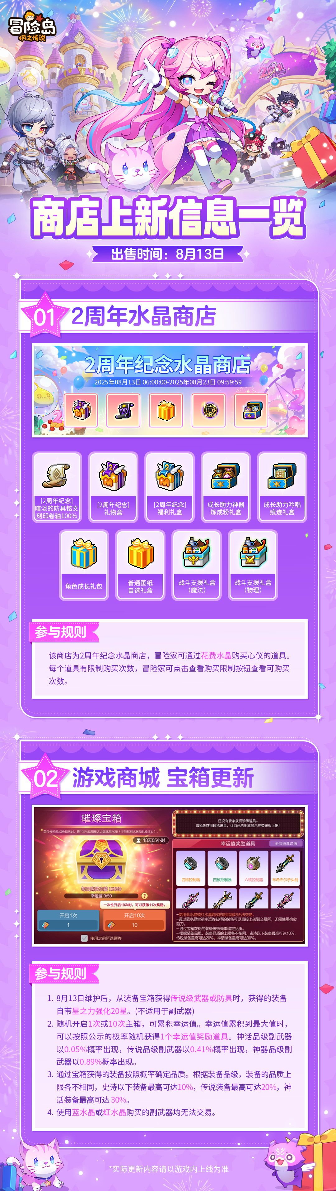 本次更新【2周年水晶商店】,内有周年福利礼盒等你开启,更有超多实用道具,使用水晶即可购买,千万别错过!