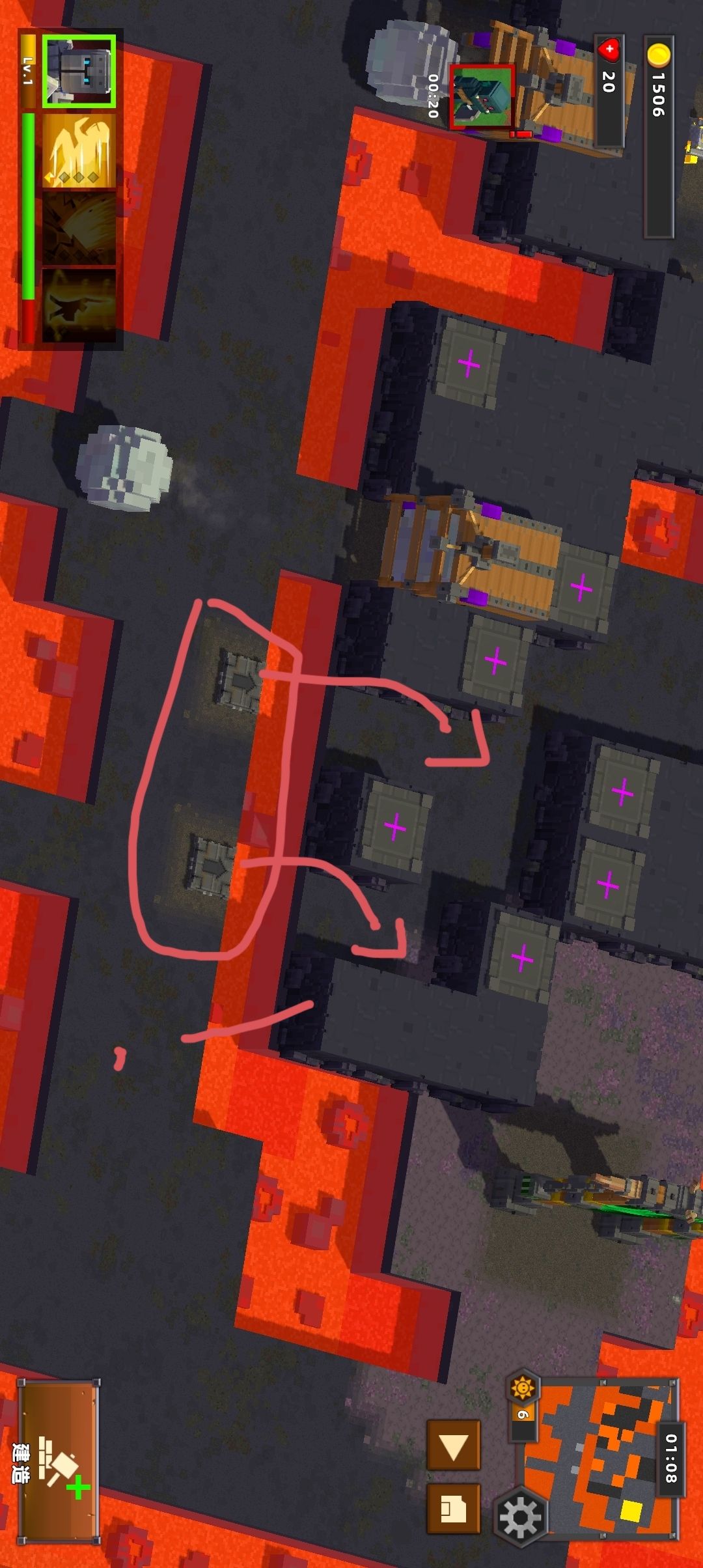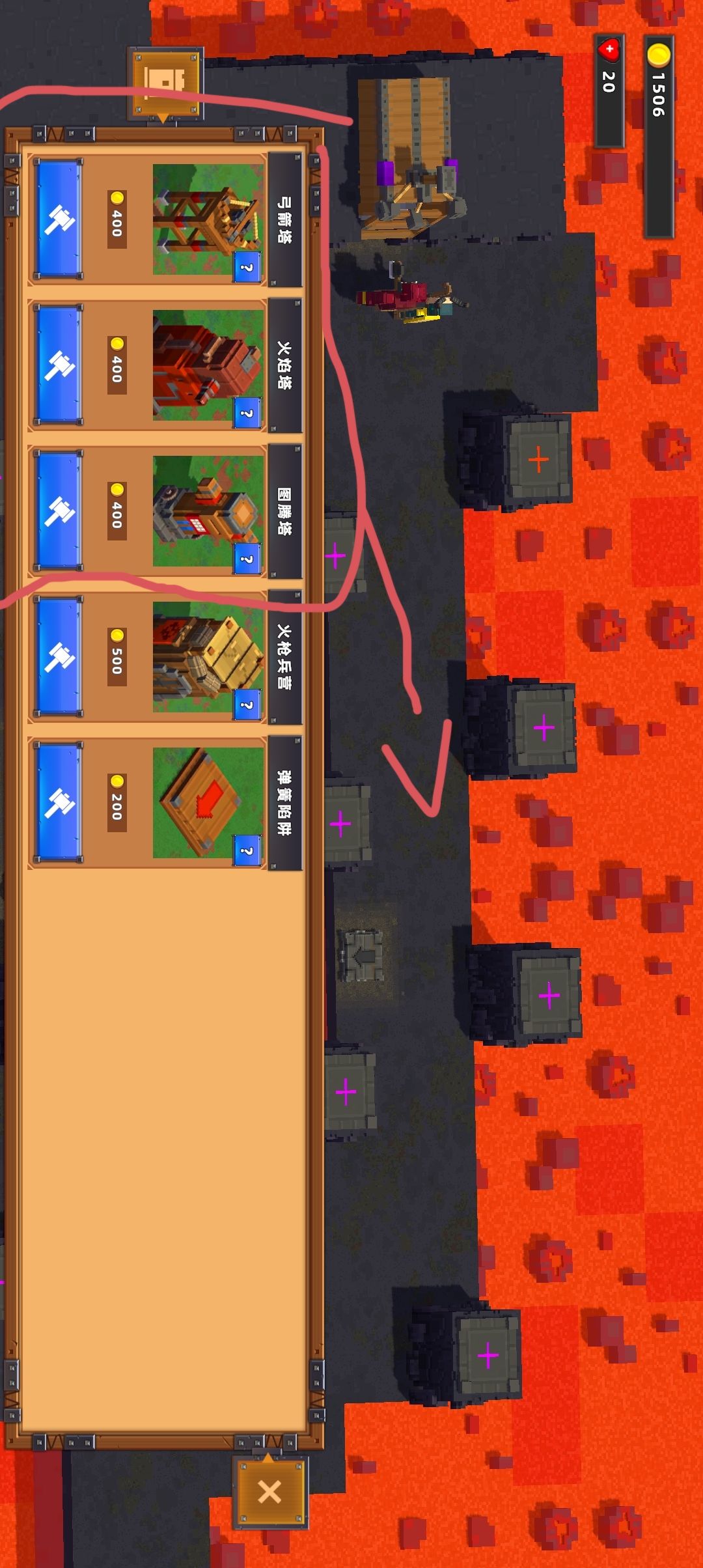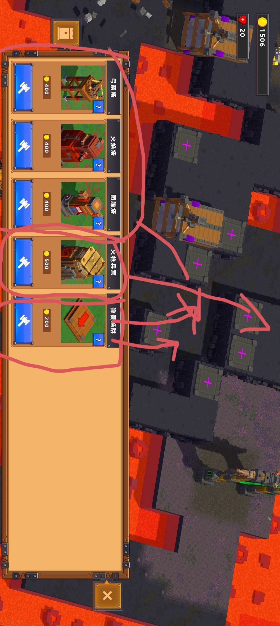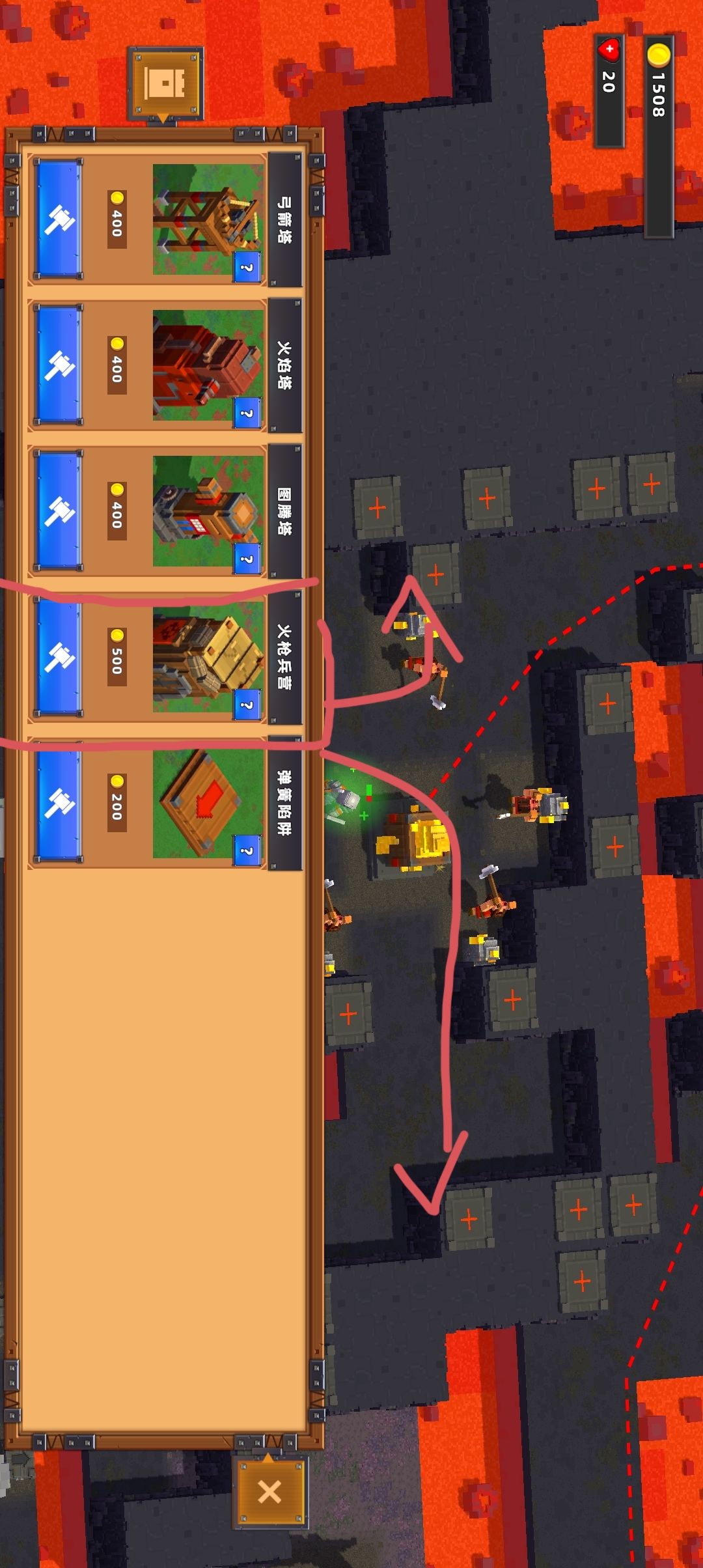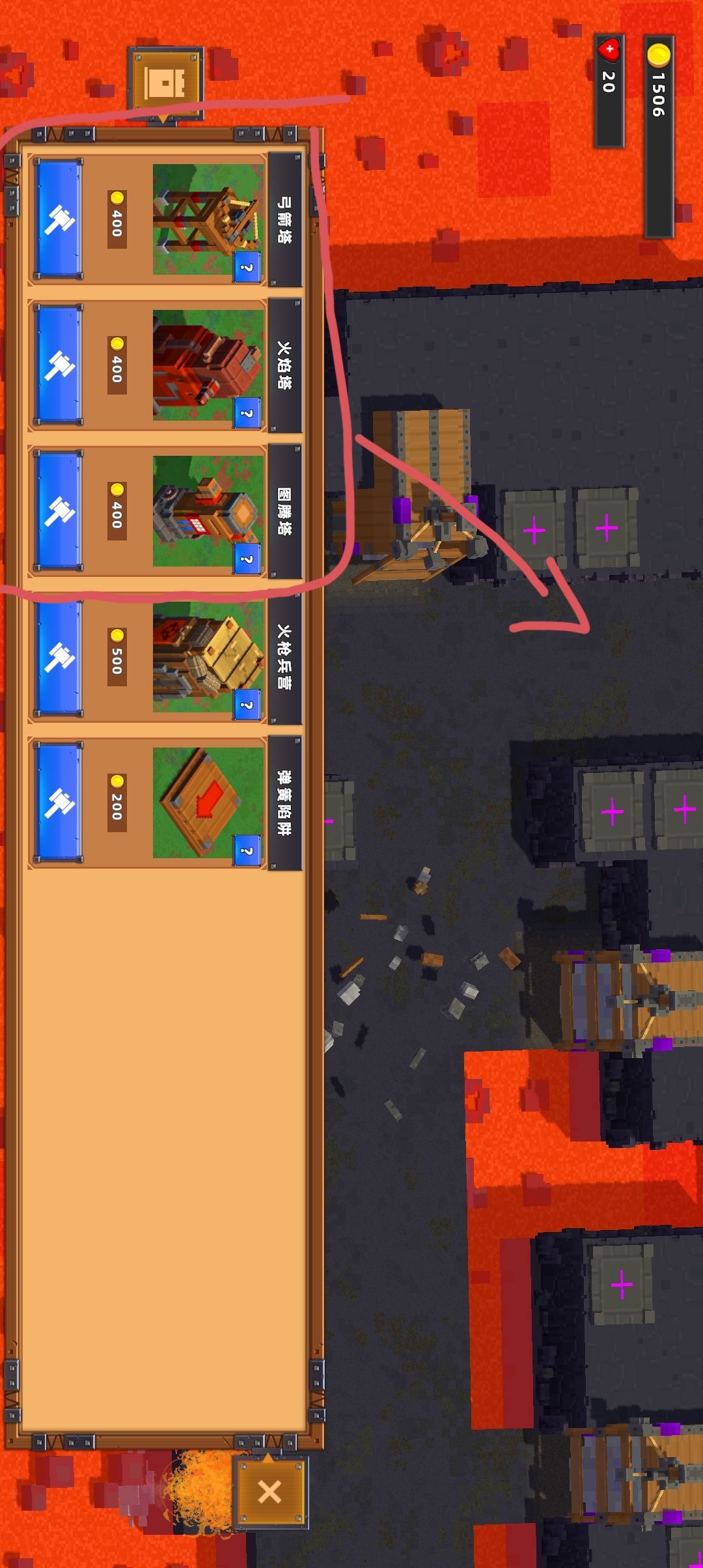 (图5)将圈起来的攻击塔放置在箭头所指示槽位,并将弹簧陷阱放置在箭头所指示位置给予攻击塔输出空间(老六打法,升级后要么弹到岩浆里泡澡,要么哪儿来的回哪去)