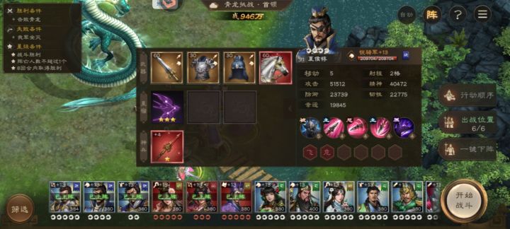 3.第二回合重点,夏侯惇先手开大,星符木月3星危月燕,稳定挂2个debuff,夏侯渊开大直接打死boss(注意有bug,夏侯渊再动后射死会被判成3动,最好大招5下+1下连击直接射死),星符选择比较多,我带的金日3星+攻击,特别注意因为需要夏侯惇先手挂debuff,所以夏侯渊攻击要比夏侯惇攻击高,吃到貂蝉加攻击更舒服。