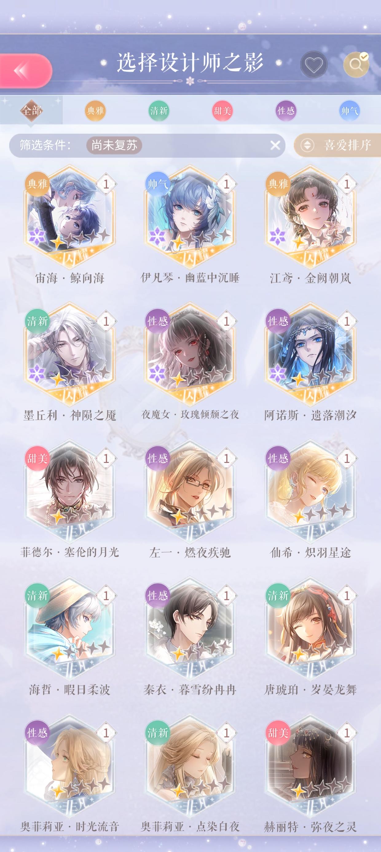 2025/8/12 满天星进度:设计师之影 241,已复苏214,未复苏27,可复苏2非凡2稀有典雅未拉满13稀有,清新未拉满14稀有,甜美未拉满16稀有2非凡,性感未拉满11稀有1非凡,帅气未拉满4稀有