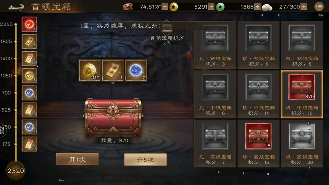 日常的首领悬赏箱子,每日建议开启量不超过5个,其余的留着,等活动开启,直接2分钟拉满