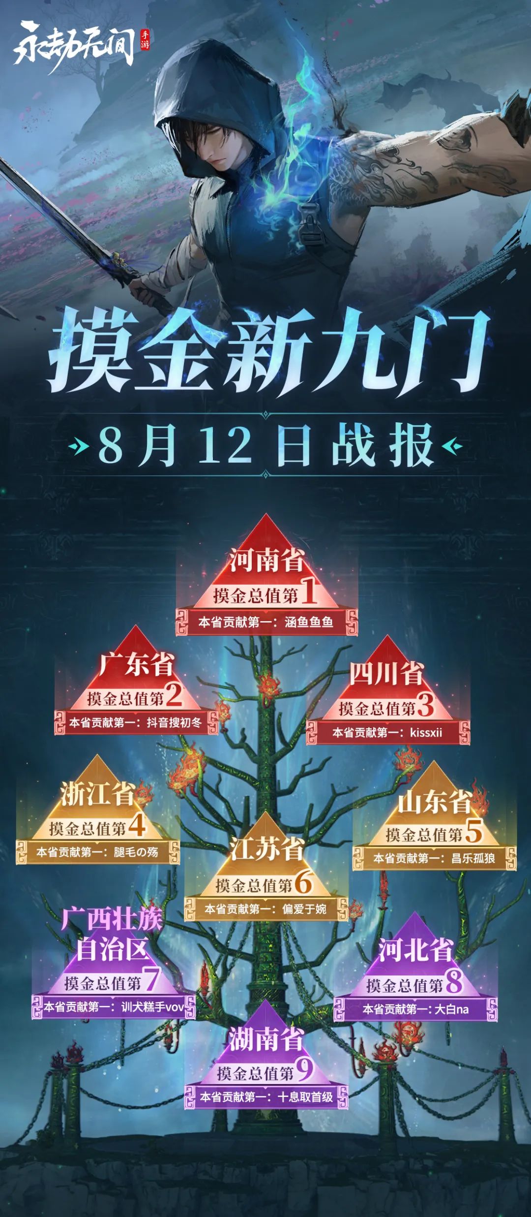摸金九省排名较昨日没有变化,前二省河南、广东排名已基本定型,其他省份之间差距仍有望追齐赶超!湖南省贡献第一易位,九门提督的位置不到最后时刻,仍就未定!自选神品时装、游戏内专属称号等丰厚奖励在向各位英雄招手哦~