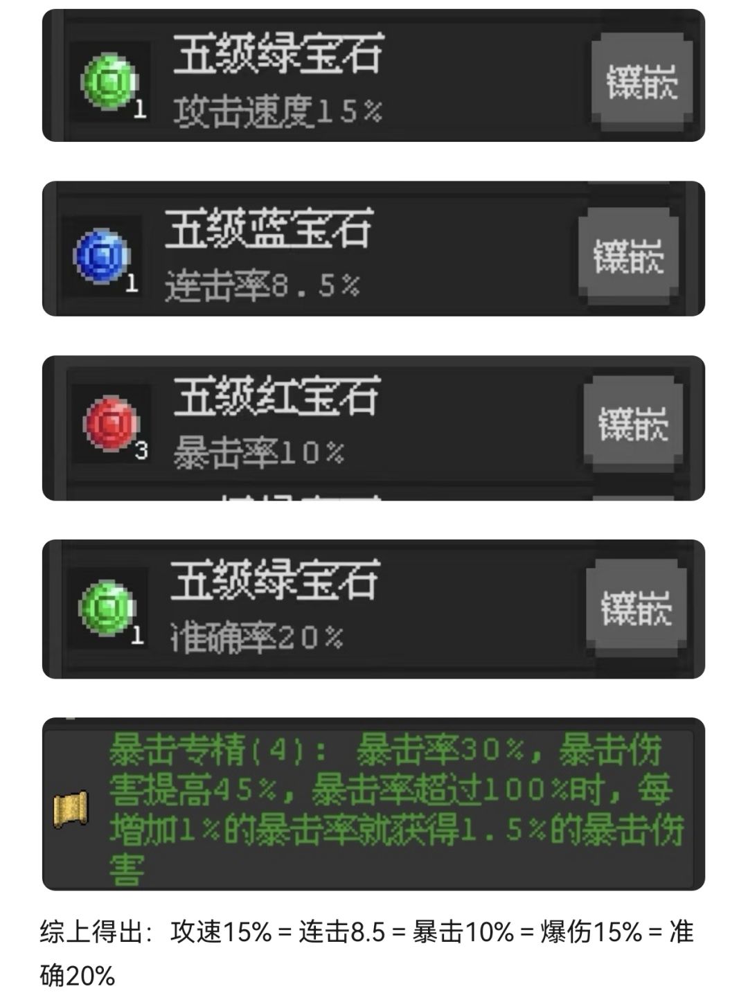首先我们要明白神鹰最重要的属性连击、暴击、攻速、准确之间的转换值是多少,下面以五级宝石为例: