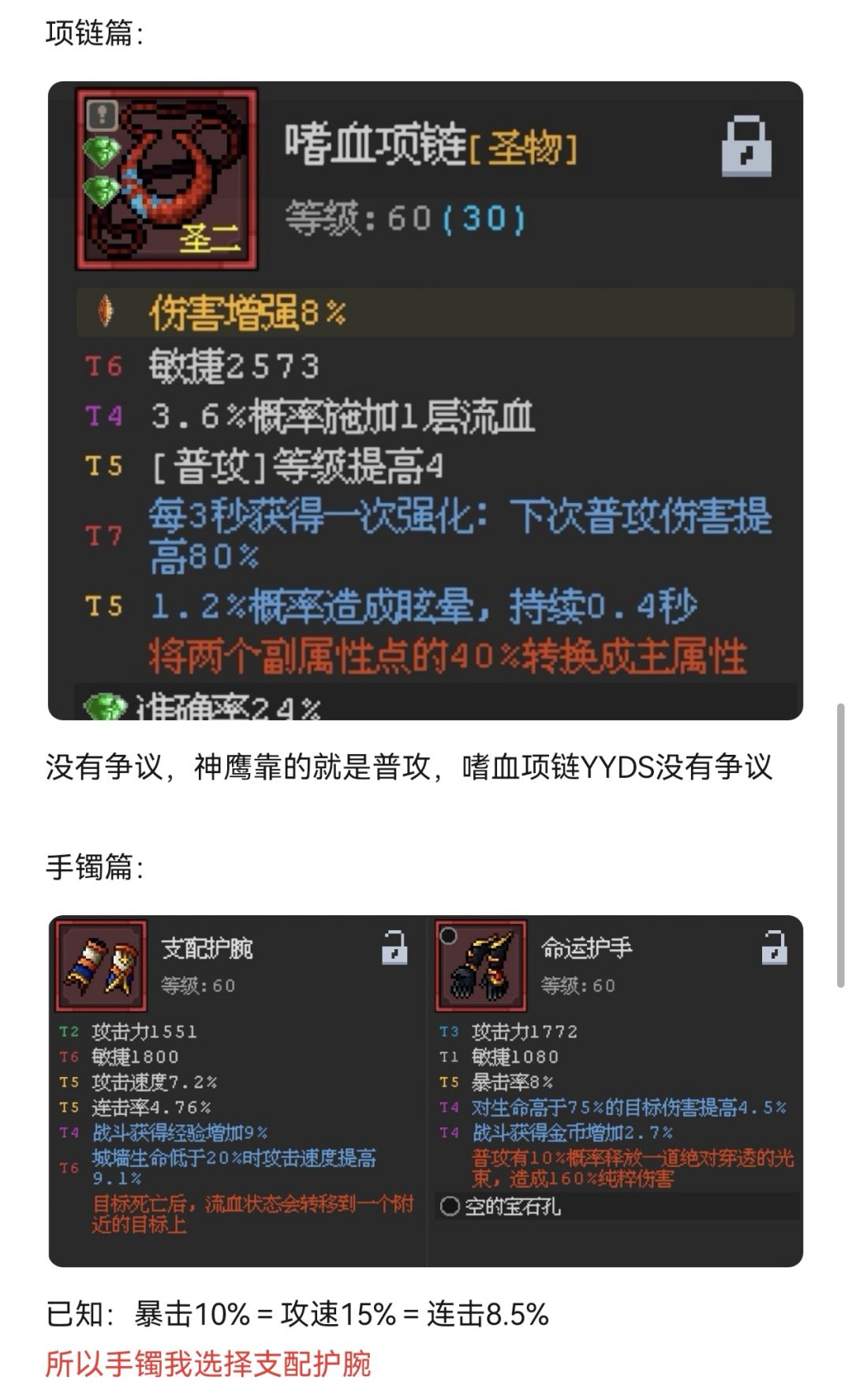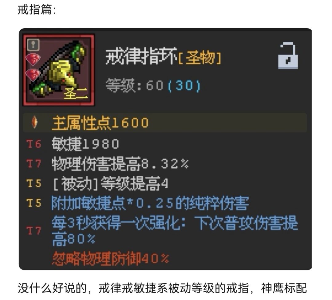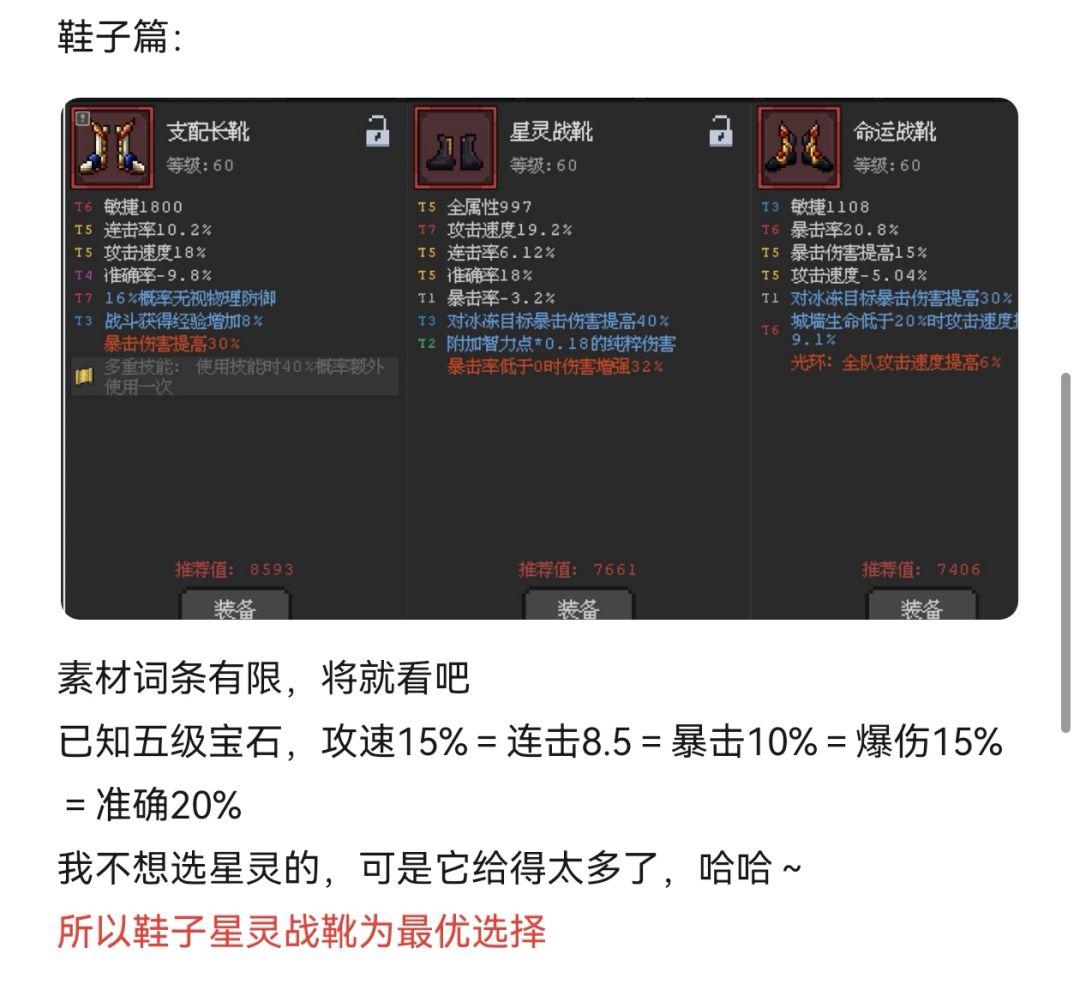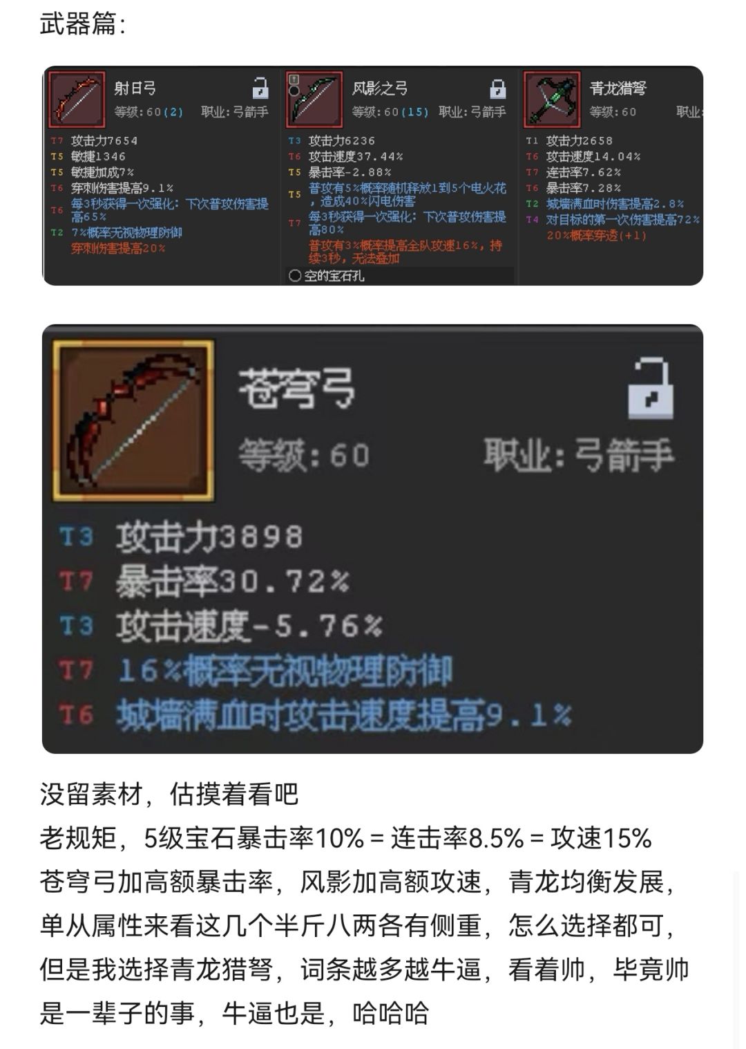 关于武器,后期连击率、暴击率都能90%-100%后射日弓更强哟。强的点在于具备敏捷词条(具备敏捷词条的装备强化收益更高)和敏捷加成以及穿刺伤害。