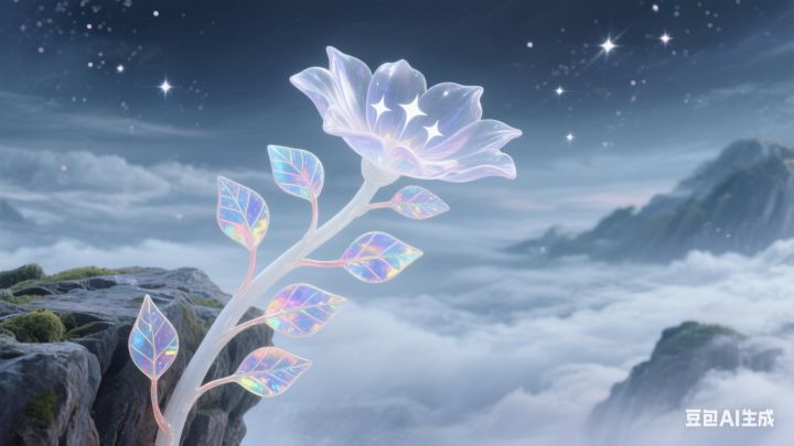 【外观描述】主茎如凝脂白玉,高逾三丈,枝蔓呈流霞之色,每节藤上生有七片菱形叶片,叶缘泛着七彩毫光。顶端托举着一盏琉璃状花盏,盏内孕育着三颗星辰般的籽实,花瓣开合间洒落星辉似的光点,无风自动时发出清越如鸾鸣的声响。