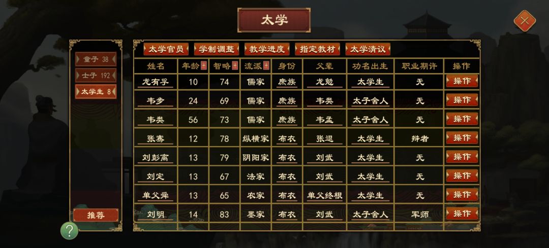 等到原来圣人阶段的朝堂官员大多都获得相应身份时,这时有两个玩法,①对学制、考试科目、太学经费不做调整,确保朝臣谏言人才进入太学或者推荐察举、集贤人才进入太学能大量考取名次,大量安排在到郡、州等官职就职;②学制调整为三年制、考试科目全选、太学经费调整为骄奢,任命不同的带职业身份的人才担任经术博士,推荐高智略人才进入太学重点培养,确保人才可以获得技艺buff,每到太学岁试时,将成绩能达到上第的考生踢出考试,重新学习直到获得满级技艺buff,之后在教学进度里对该生进行摒出操作即可,可以批量培养携带不同满级技艺buff的人才。