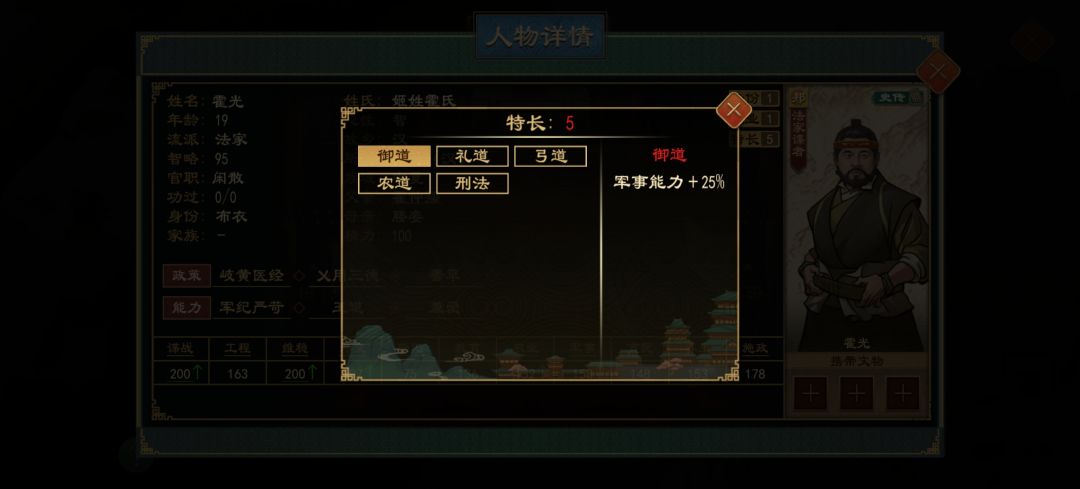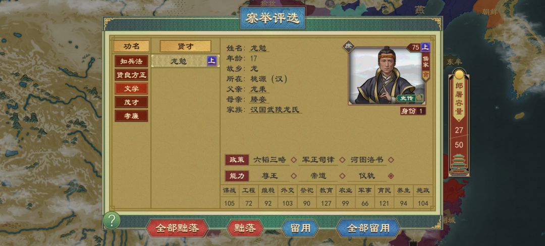 说明:军事能力高时,人才筛选为"知兵法";教育、祭祀能力高时,人才筛选为"文学";智略高、心性好时,人才筛选为"贤良方正";智略较低、心性较差时,人才筛选为"茂才";育民、养生能力高、心性好时,人才筛选为"孝廉"。(集贤令集贤人才筛选条件均为"贤良方正")