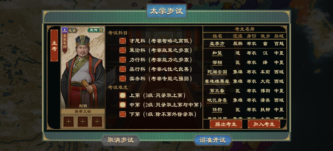 当成年学生的学时达到其学制时间,便可参与太学考试。在考试中,玩家可以选择考试的科目以及录取科第的标准。学生将根据其在各项科目中的发挥取得上第、中第、下第、不第其中一种科第,并根据考试难度决定其在本次考试中实际取得的科第与成绩。