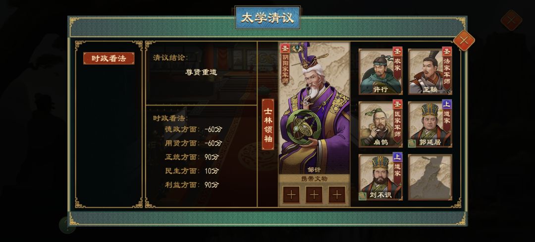 正统方面分最高时,清议结论为传承有序,buff详细为:正统+3/年