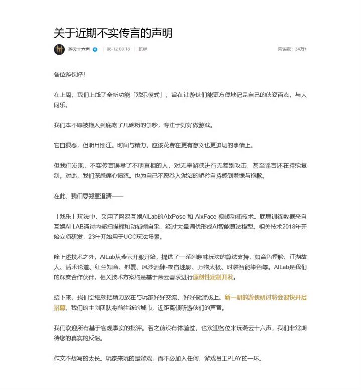 玩家们纷纷围观,猜测这背后的“故事”。毕竟都是网易旗下游戏,这样的“内战”确实少见。就在大家议论纷纷时,今日《燕云十六声》终于发布回应,那意思似乎在说,玩家不用卷入游戏员工之间的“拉扯”。