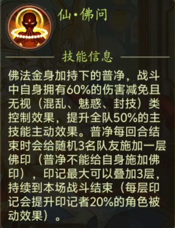 首先,普净自身拥有免控+60免伤,需要注意的是只是免控,不免疫其他的负面状态(如减速,降防,灼烧等),这个没啥好说的。