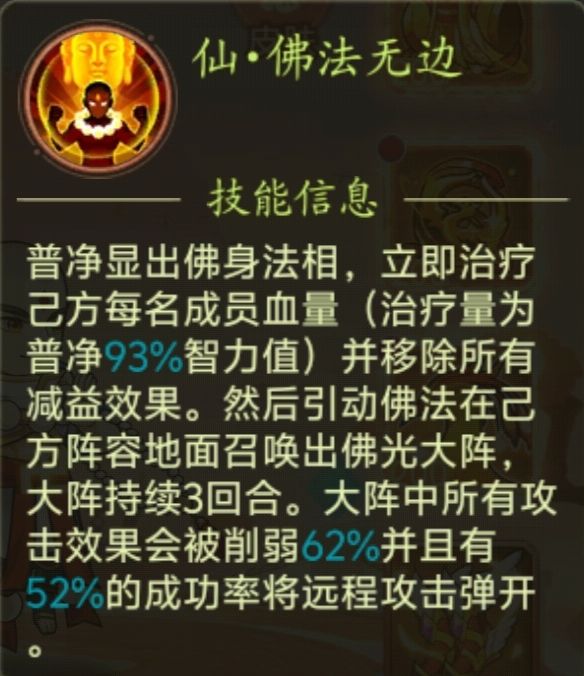 3回合62免伤,清除负面+回血+概率弹远程,和尚的主动也是非常强大的,除了治疗量有点少。