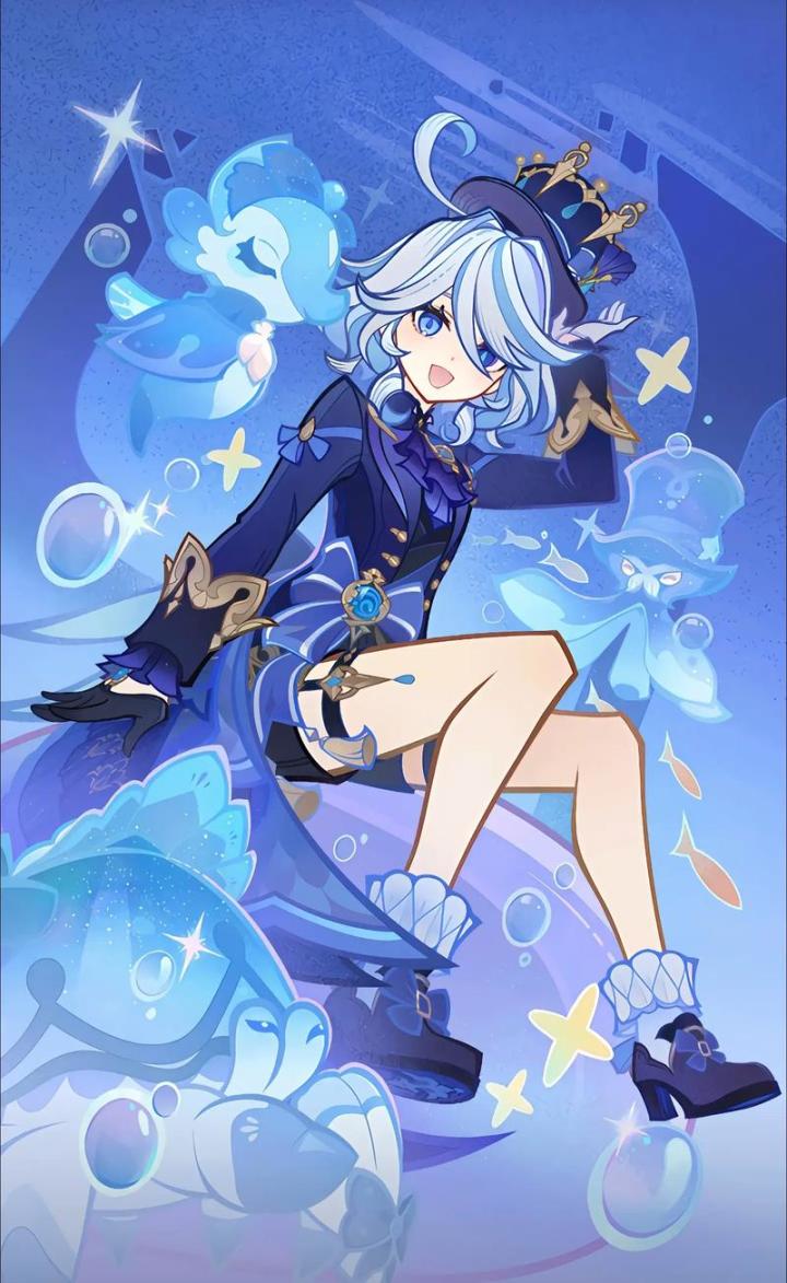说起来,我和她大概是真的有缘分吧。为了等她的卡池,我攒了快半年的原石,每天上线第一件事就是对着枫丹的海面许愿,怕自己手黑抽不到,连专武池都不敢轻易碰。结果卡池开放那天,我深吸一口气按下十连,金光炸开时看见「芙宁娜」几个字跳出来,心脏都快蹦到嗓子眼;紧接着补了几发想冲二命,居然一次没歪,连带着专武池也一发入魂,那把「静水流涌之辉」安安稳稳躺在背包里,像是与她早就备好的约定。