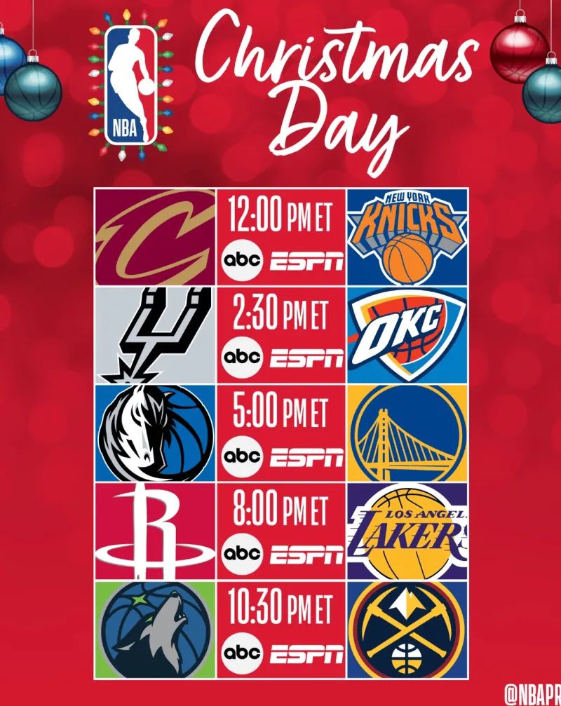 NBA官方今日公布了2025-26赛季圣诞大战赛程,具体如下(北京时间):