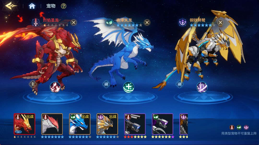 宠物系统也是提升战力的养成部分。宠物共有蓝/紫/橙/红四个品级,进攻/辅助/强化三种类型,每种类型宠物仅可携带一只,也就是一共3只宠物。进攻型宠物技能为造成伤害,辅助型宠物技能为回血,强化型宠物技能为增伤。