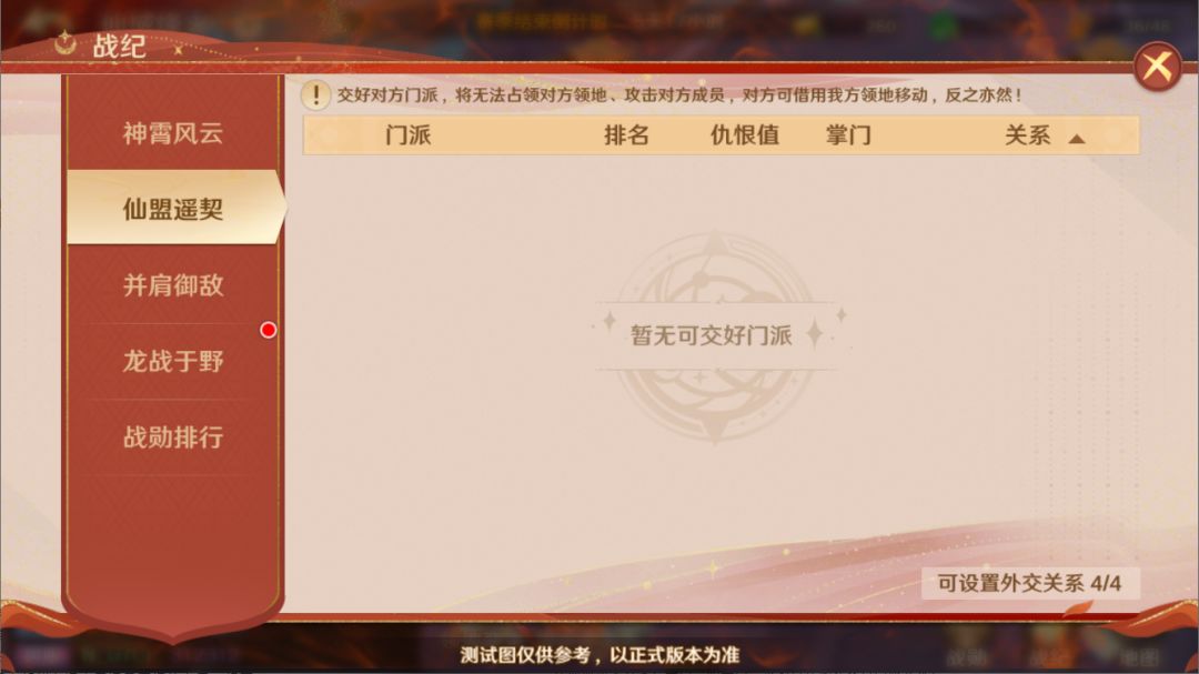 ● 交好对方门派,将无法占领对方领地,无法攻击对方成员,对方可借用我方领地移动。并且当对方是攻城时的宣战门派时,对方攻城将不会攻击己方临时驻扎的成员。