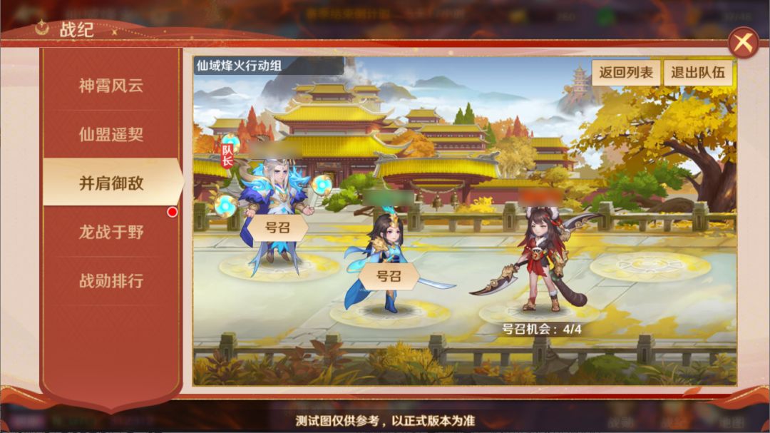 守护使可在并肩御敌分页和门派成员组成至多4人的小队,共同行动。同一队伍下的守护使,能够号召其他不在玩法内的守护使,使其向指定城池发起移动,每次移动都需要消耗发起者的号召机会和被号召者的行军令,每人每日拥有4次号召机会,凌晨4点恢复至上限。