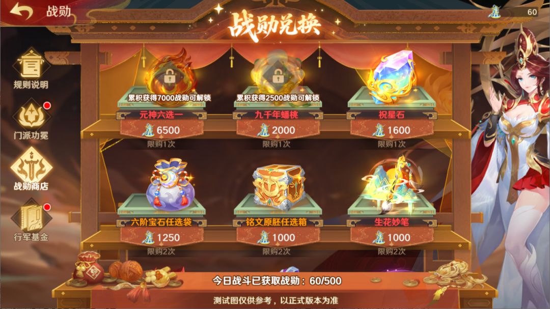 在战勋商店分页,守护使大人可使用获得的个人战勋来兑换祝星石、紫瑛石、六阶宝石任选袋、铭文原胚任选箱等道具。在累积获得2500点和7000点战勋后,还可分别解锁九千年蟠桃和元神六选一的兑换次数。