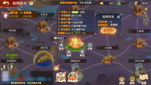 ● 进攻临近城池时,守护使可手动开启连攻模式,此时只要未战败,就将一直消耗行军令对其发动攻击。