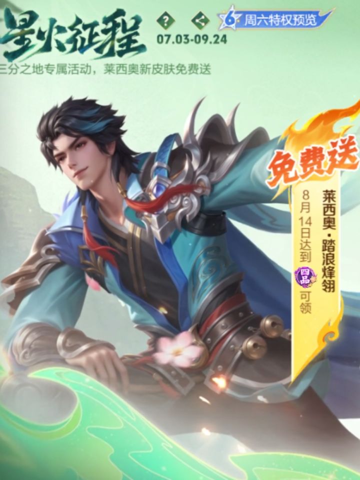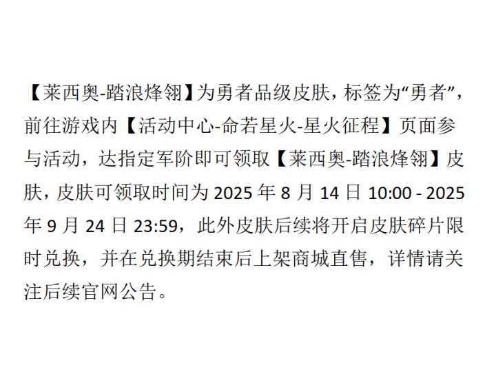 【莱西奥-踏浪烽翎】为勇者品级皮肤,标签为“勇者”前往游戏内,活动中心-命若星火-星火征程,页面参与活动,达指定军阶即可领取【莱西奥-踏浪烽翎】皮肤,皮肤可领取时间为2025年8月14日 10:00-2025年9月24 日23:59,此外皮肤后续将开启皮肤碎限时兑换,并在兑换期结束后上架商城直售。(盲猜488点券)