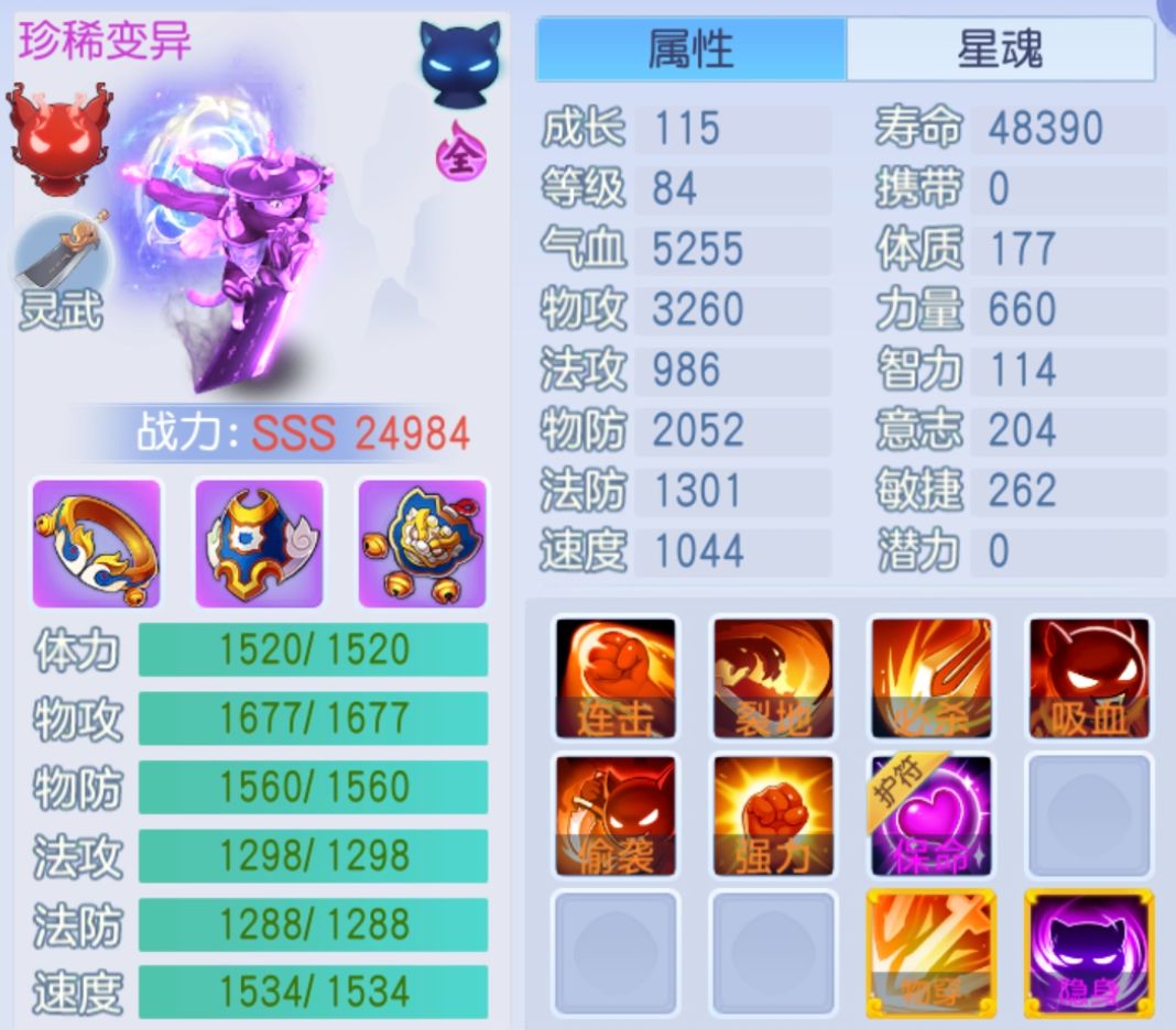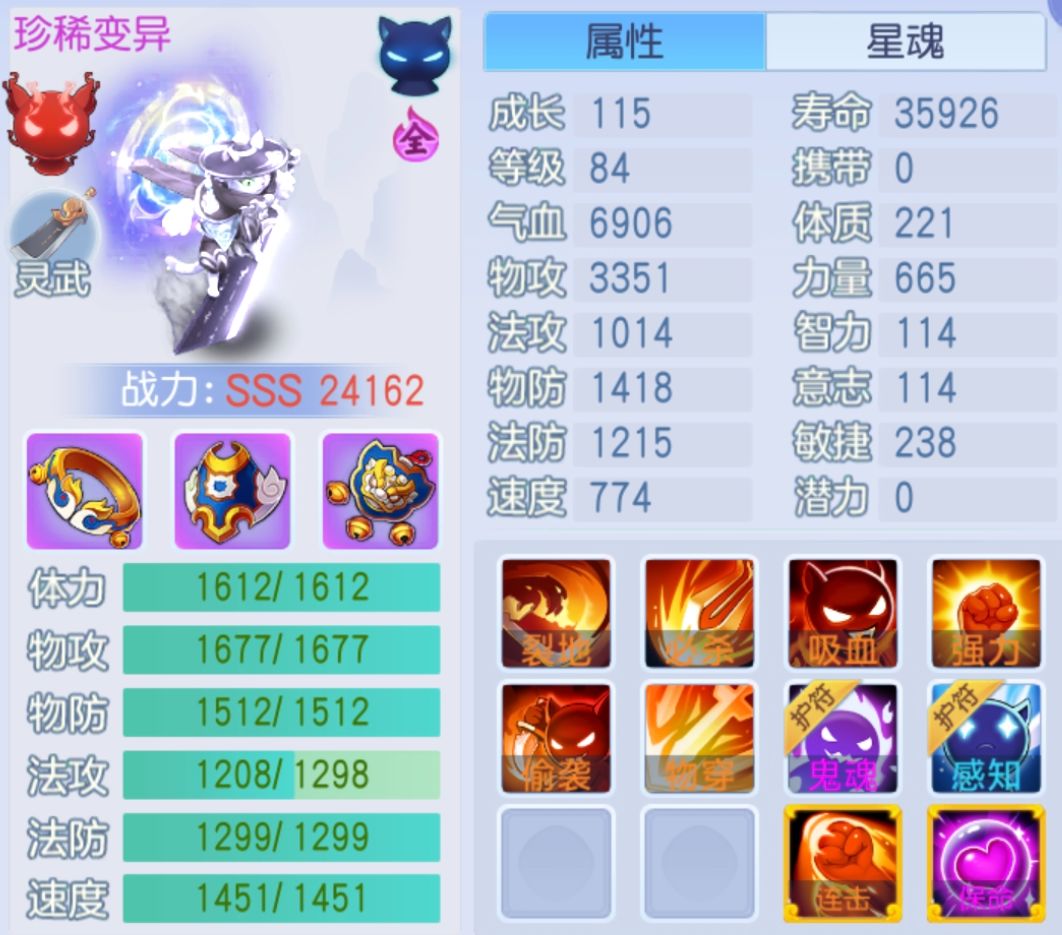 宠物资质成长115全满,物攻、物防、速度资质全满,体力和法防稍弱,但核心物攻和速度到位,整体资质尚可。