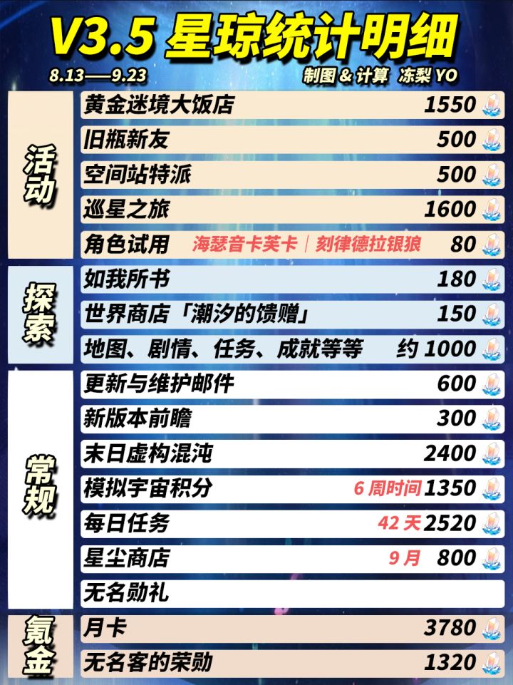 【V3.5攻略】崩铁3.5版本可获星琼统计