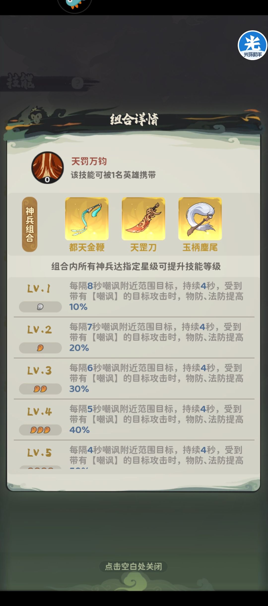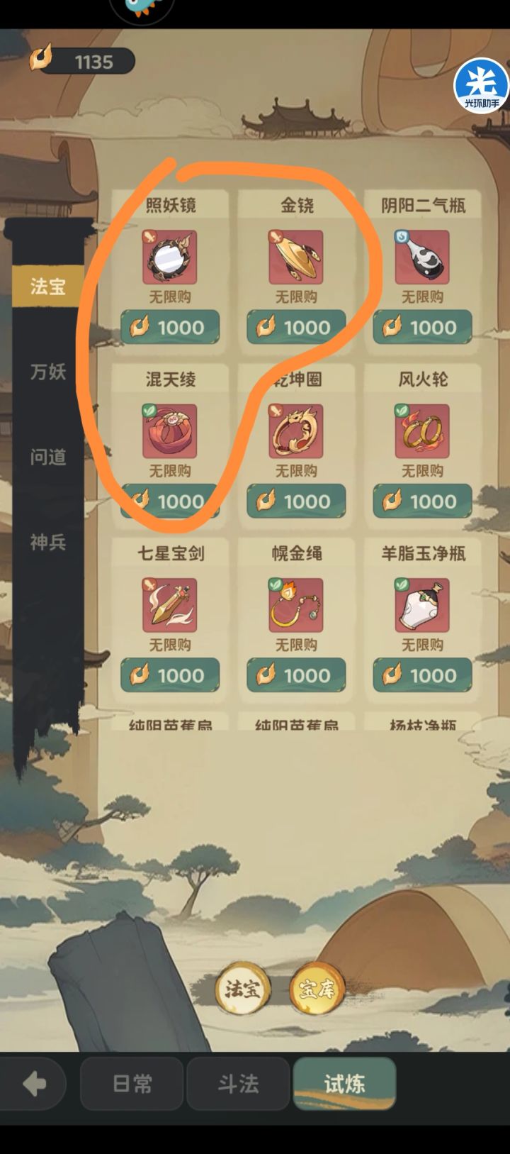 推荐理由:红色法宝才是后期标配。并且刷到红色法宝又没钱买也不怕,商店自动增加的是刷新次数,不刷新商品。刷新10次才1000代币。