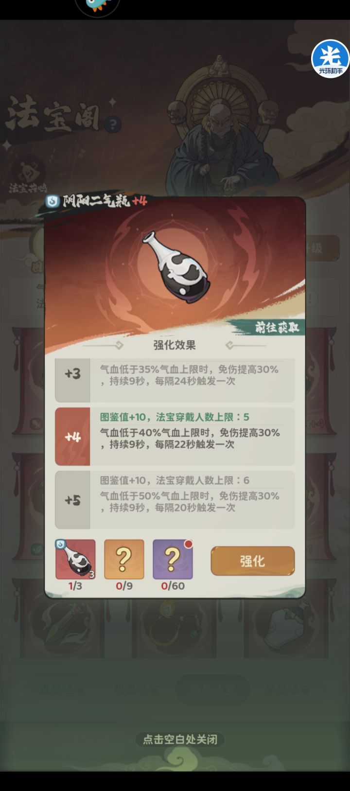 每天没花完的代币就买紫色、橙色法宝,后期法宝升级需求狗粮巨大,如红色4升5需要9个橙色+60个紫色。见图1/2/3