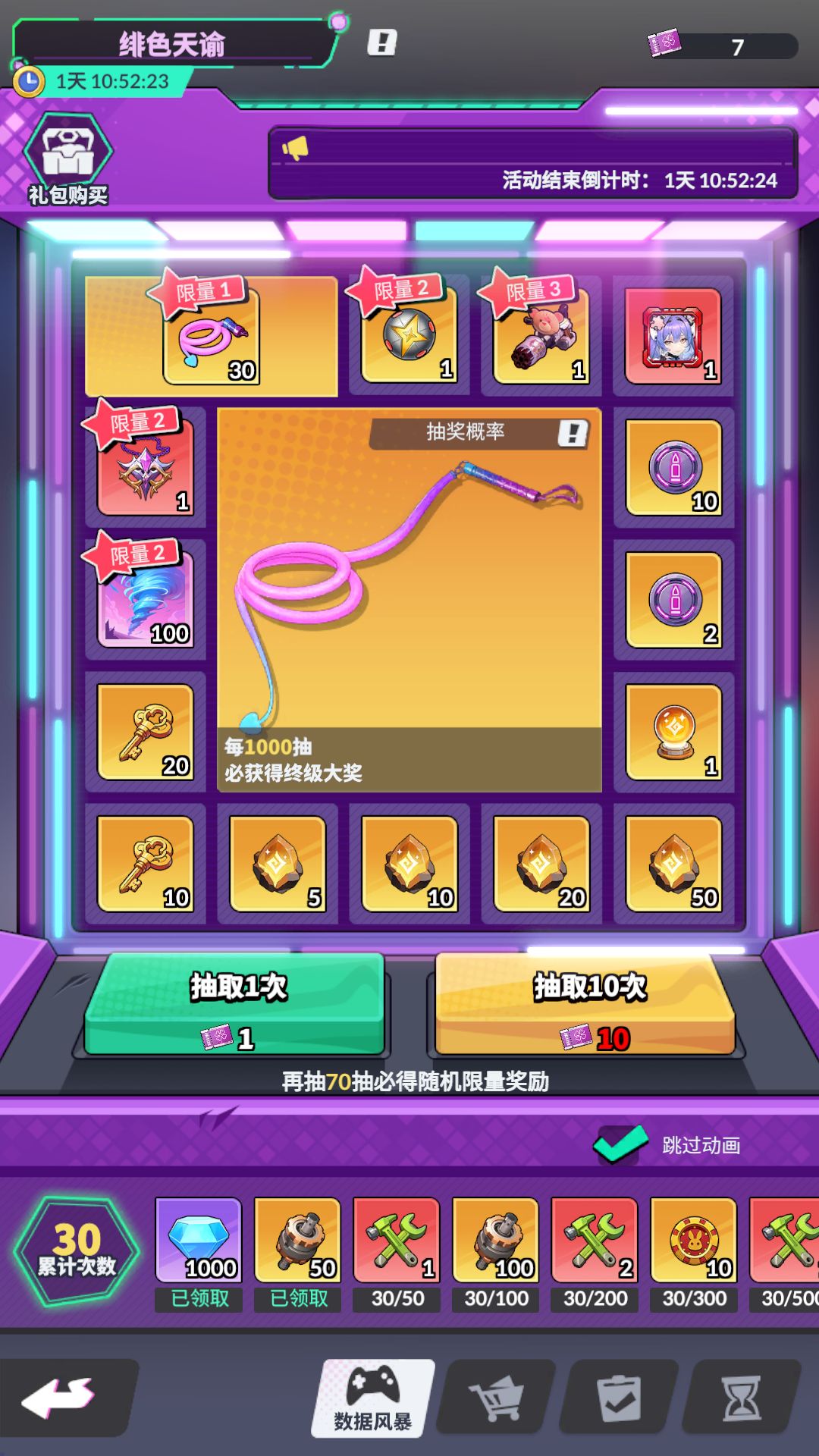 7500钻石20抽,个人觉得只有这个性价比是最高的,剩下的15000钻石10抽可以根据需求来买,可以结合着转盘任务搭配抽奖券。