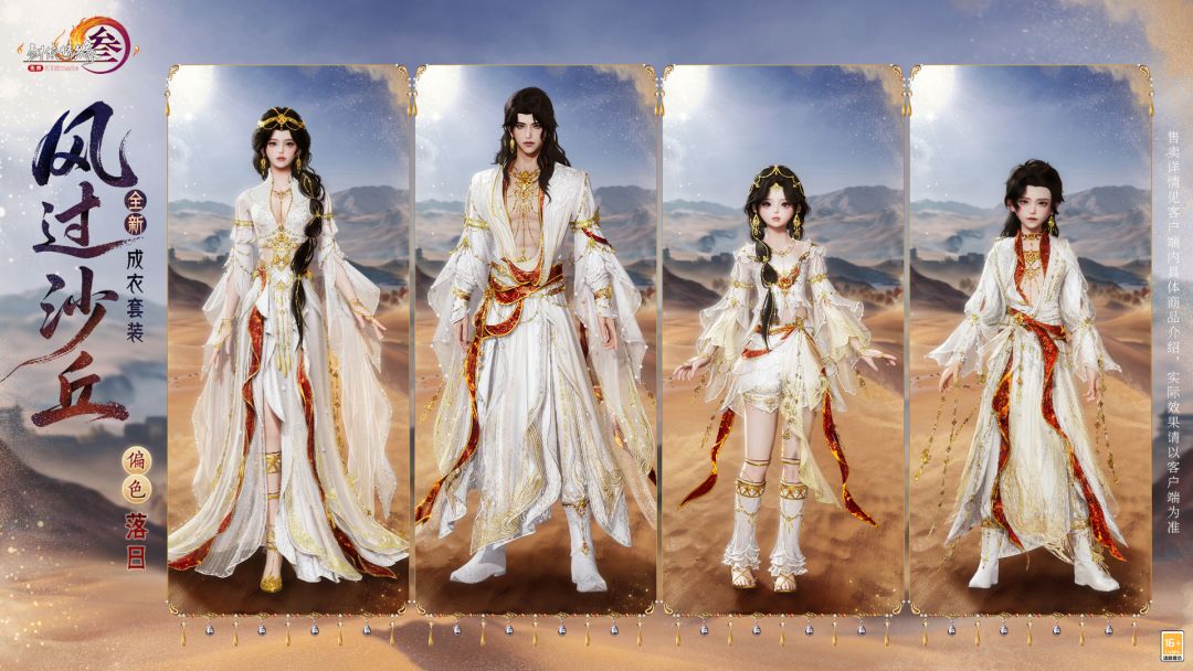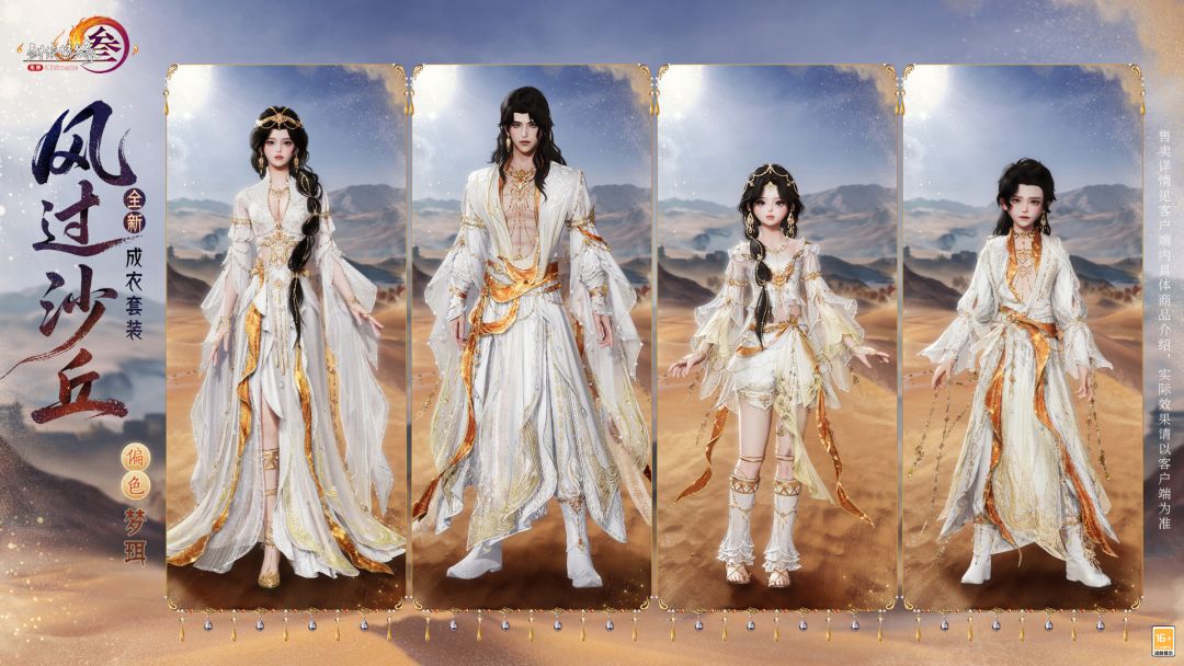 衫痕浅镀暮云金,长天曳影客逍遥,全新成衣套装“风过沙丘”撷漠上自由之风,白色衣袍如朔风舒展,潇洒无拘。襟袂裁作层叠弧纹,细碎金纹若流沙铄金,鎏金环佩随步履轻摇,如沙丘漫卷的流岚轻抚大地,织就漫越万里荒原的大漠之歌。