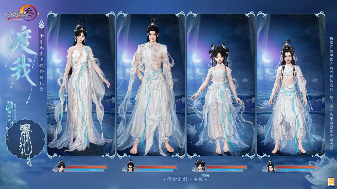 礼盒包含基于 Body3.0模型和新布料设计的特效动作成衣+定制白发+特效腰部挂件“清净光”+ 附赠定制黑发+附赠绑定款小头像。