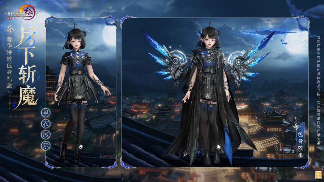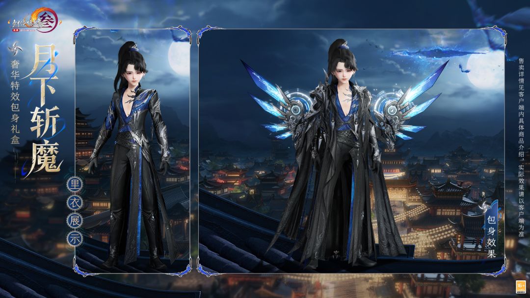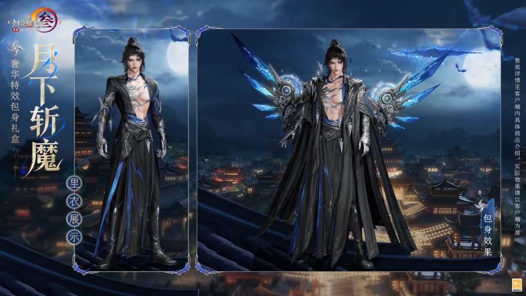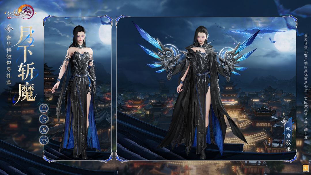 礼盒内含基于Body3.0模型和新布料设计的特效动作成衣+左肩饰+右肩饰+布料2.0披风,分为绑定款与不绑定款,售价为88,800通宝。游戏内商城及网页版商城同步上架,不可使用折扣券。