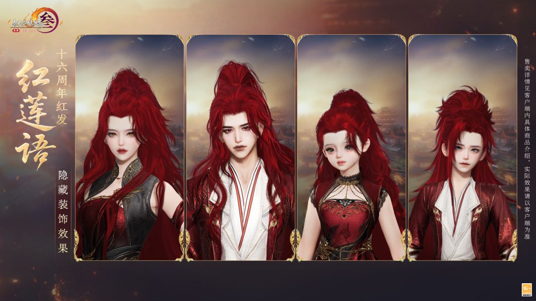 赤霞焚空开夜昼,一点灵犀惊云寰,《剑网3》十六周年纪念红发“红莲语”彰显侠者洒脱疏狂!鎏金冠冕半束长发,此红发还新增了装饰隐藏功能,期待侠士搭配头饰/挂件等位置自定义效果,打造多种创意!