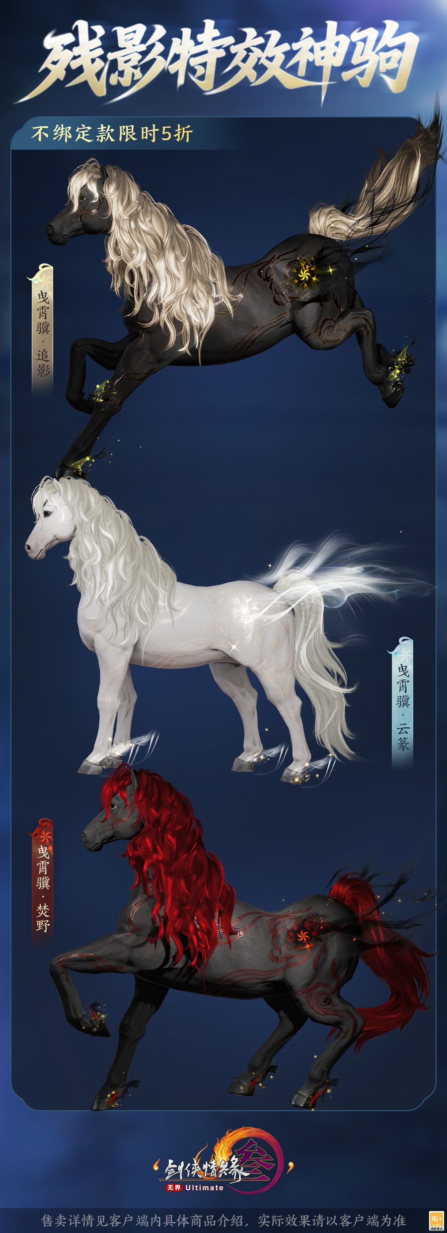神驹踏残影,曳曳碎云霄,全新残影特效神驹“曳霄骥”踏云临世,共有三种偏色可供选择。其鬃如流焰微蜷,尽显桀骜,身侧暗纹似霄云初漾,浮光流动。若嘶鸣扬蹄,则有层层旋光浮现,云雾星芒环绕粼波。腾跃时更携浮风绡光千缕,伴身御风,云漪流转泛开,渲染优雅气质。